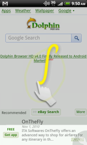 If you notice the small hand in some of these shots that’s located in the lower corner. This is the gesture area which I have found pretty entertaining myself. Getting things done with a swype of the finger is pretty cool. What you do is first setup the gestures to how you want them. Simply go to your dolphin browser, select menu, select more, select settings and then select gestures. You will find all of the information you need to setup gestures to your likings.