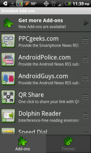 Dolphin Browser HD has several add-ons available to make the user experience a little more convenient. Instead of having to close your browser and use another application or browser for certain things such as an RSS feed or a PDF viewer, you can now install what’s needed right there from inside the browser itself. To do this, select menu, select more, select settings, select add-ons and then select get more. You will now find yourself looking at a very long list of items available. As you can tell in the picture above, they even have a PPCGeeks RSS feed add on that looks fantastic in my opinion. I love it so much I put it as my first icon on my home screen!